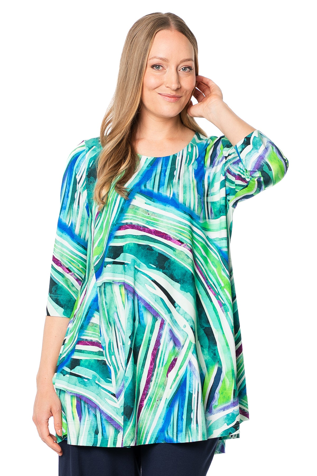 Perfect for: aqua print tunic top for women, relaxed tunic to wear with navy trousers, 3/4 sleeve holiday top with a bold print.