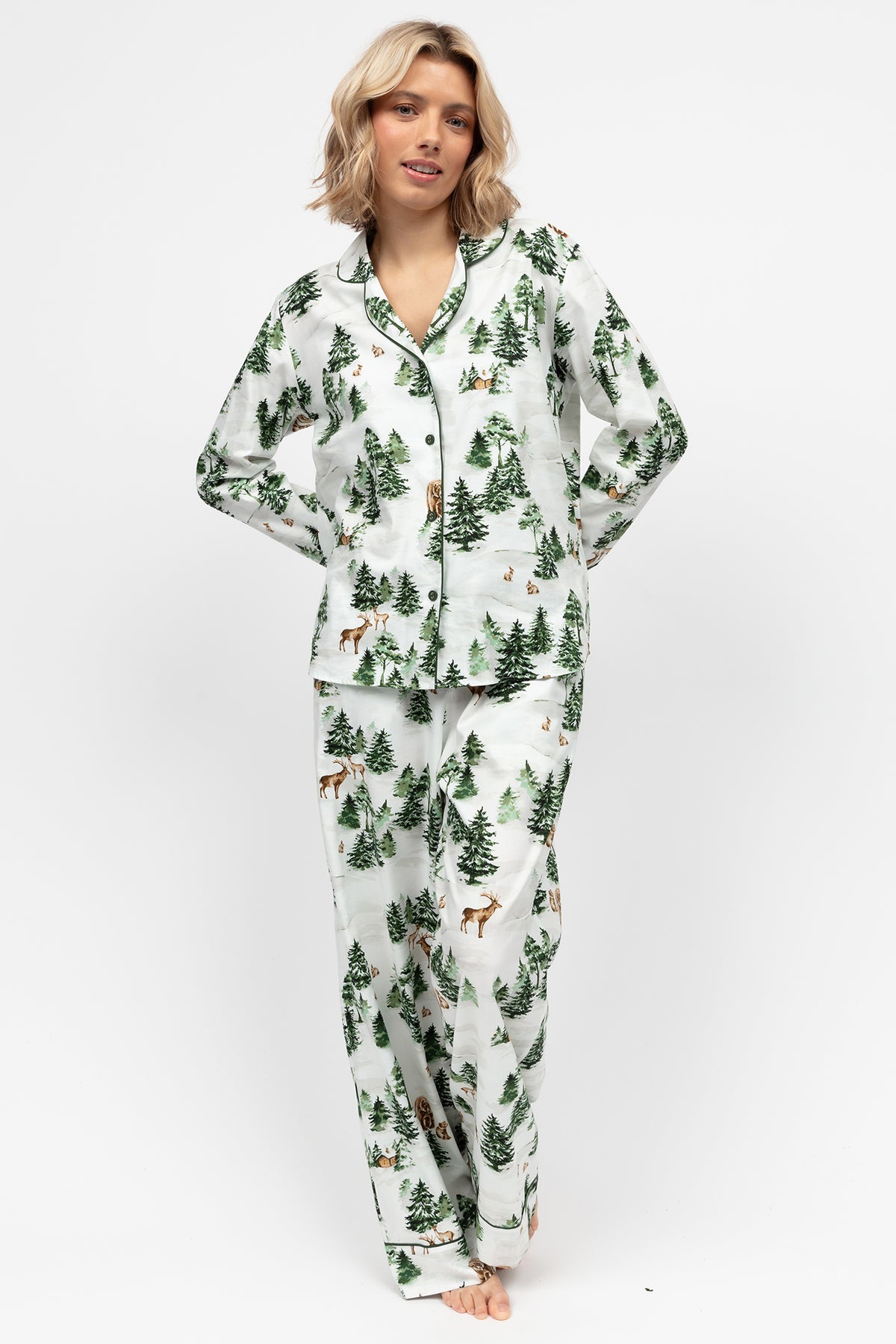 Cyberjammies 5125 Fern Olive Green Alpine Print Wide Leg Pyjama Bottoms are relaxed-fit lounge trousers with a serene forest motif—ideal for cosy nights and slow mornings.