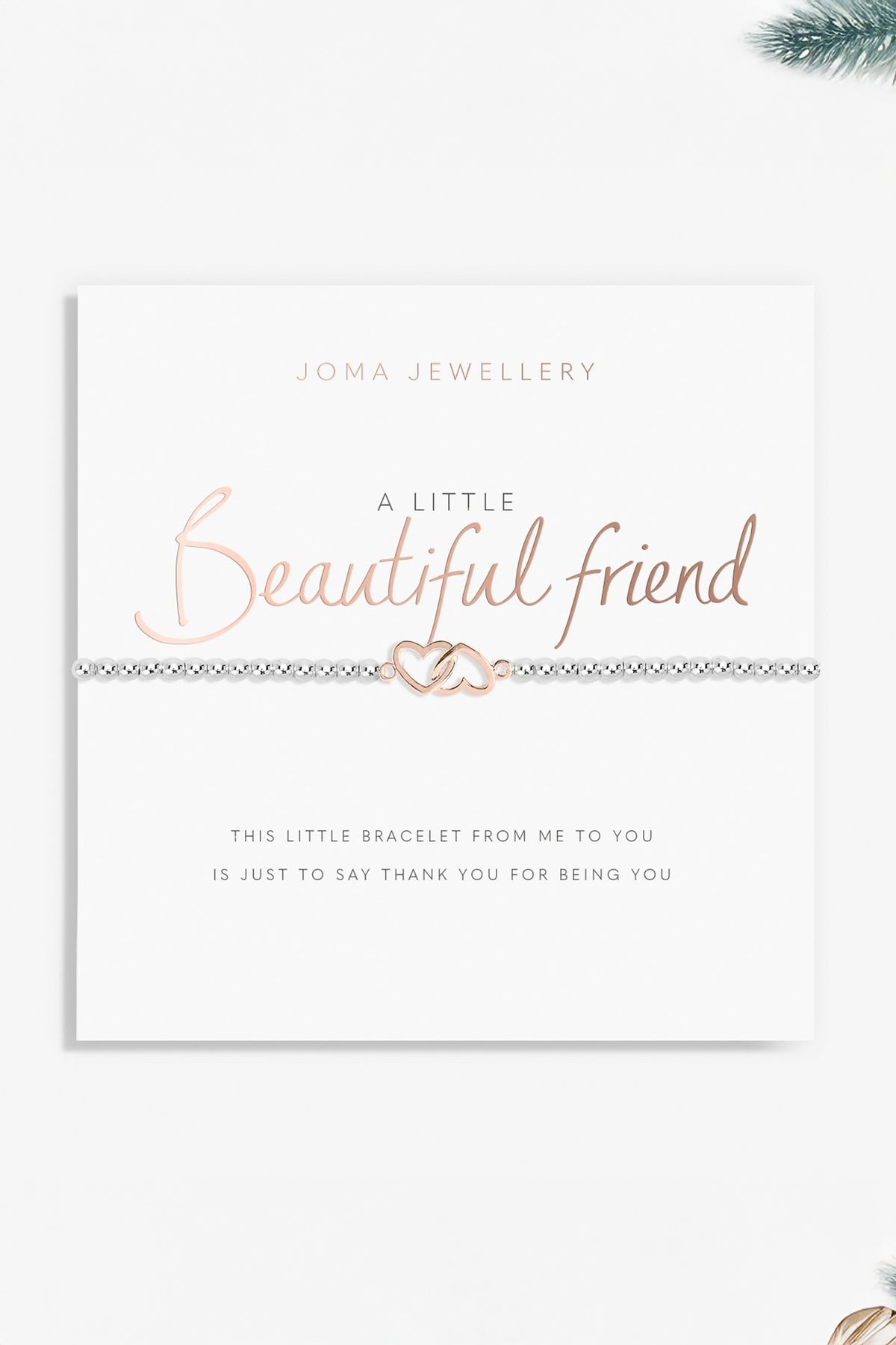 Designed to celebrate meaningful connections, the Joma Jewellery 2685C A Little 'Beautiful Friend' Bracelet features a silver-plated beaded band with a rose gold-plated charm of two interlinked hearts. It’s mounted on a sentiment card with soft rose gold accents and a heartfelt verse.
