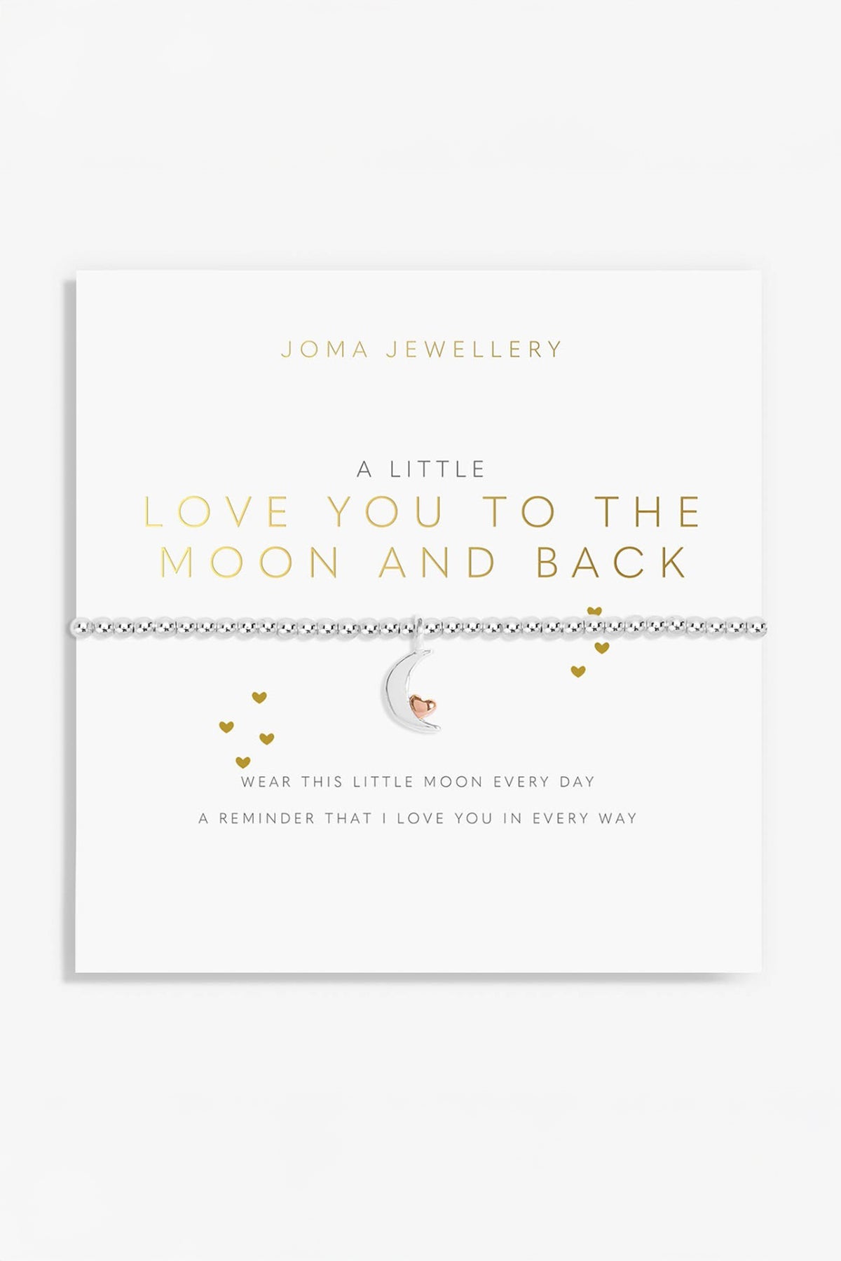 Designed to express affection with elegance and warmth, the Joma Jewellery 2521C A Little 'Love You To The Moon And Back' Bracelet features a silver-plated beaded band with a crescent moon charm, accented by a tiny pink crystal. It’s mounted on a sentiment card with gold foil hearts and a heartfelt verse.
