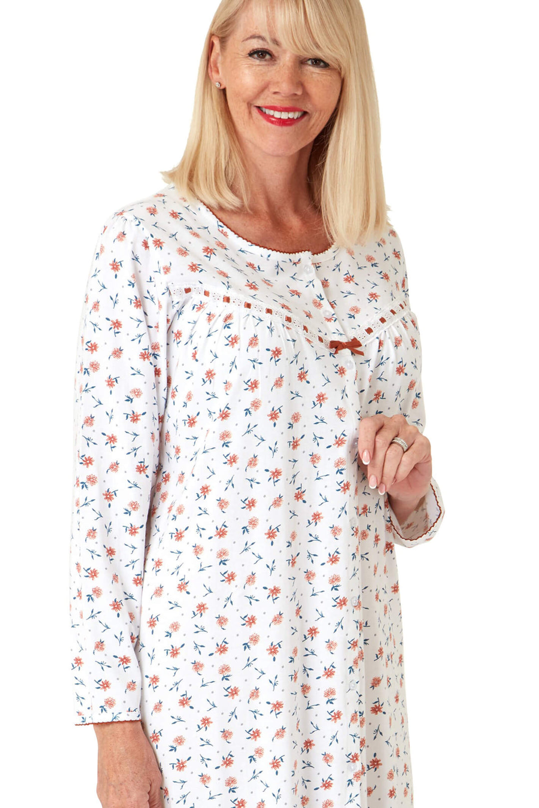 Marlon Nightdress Champagne Floral Long Sleeve Knitted Cotton Pink MA42602