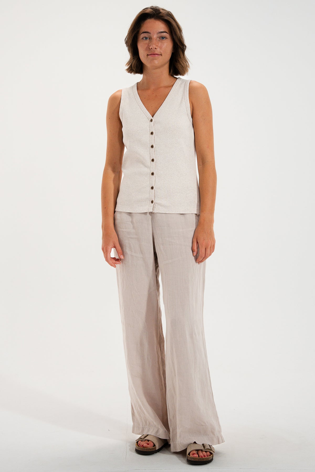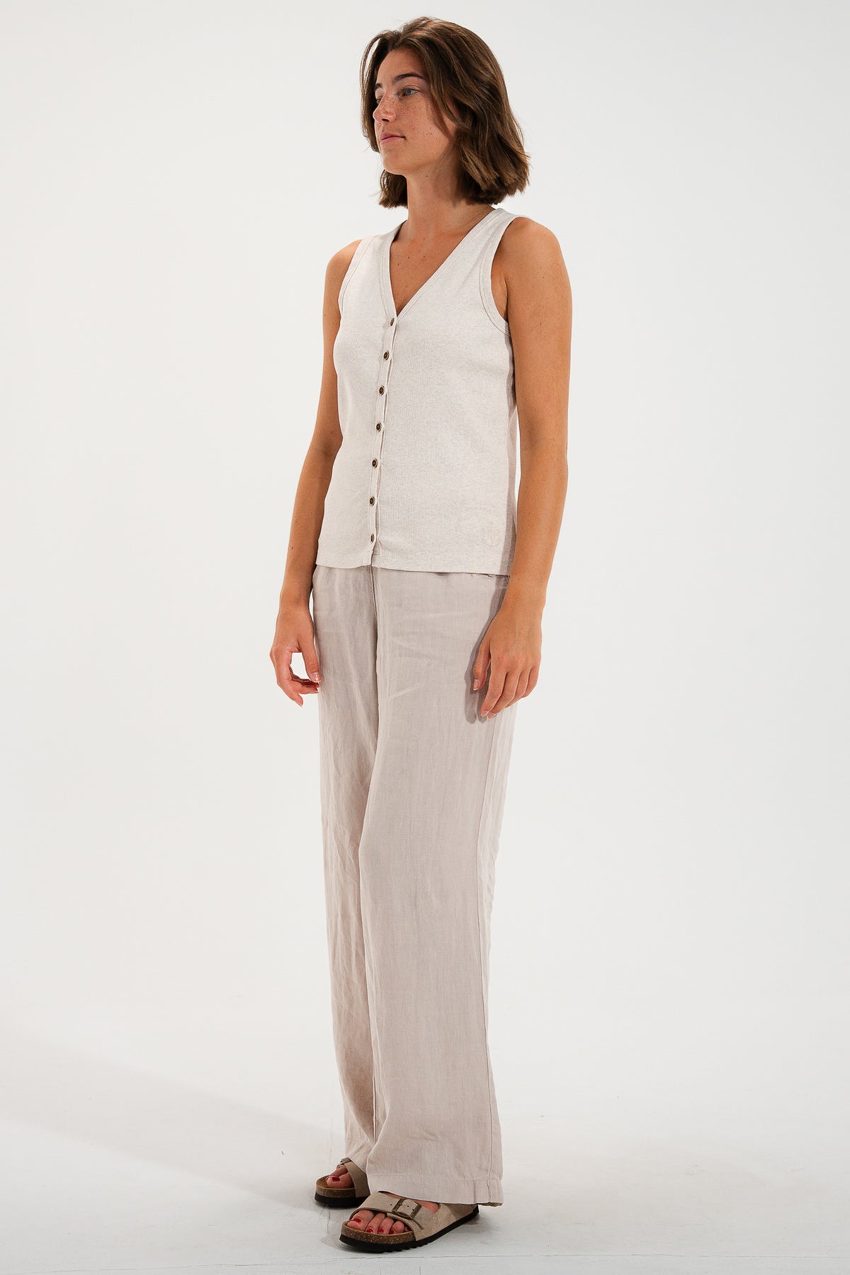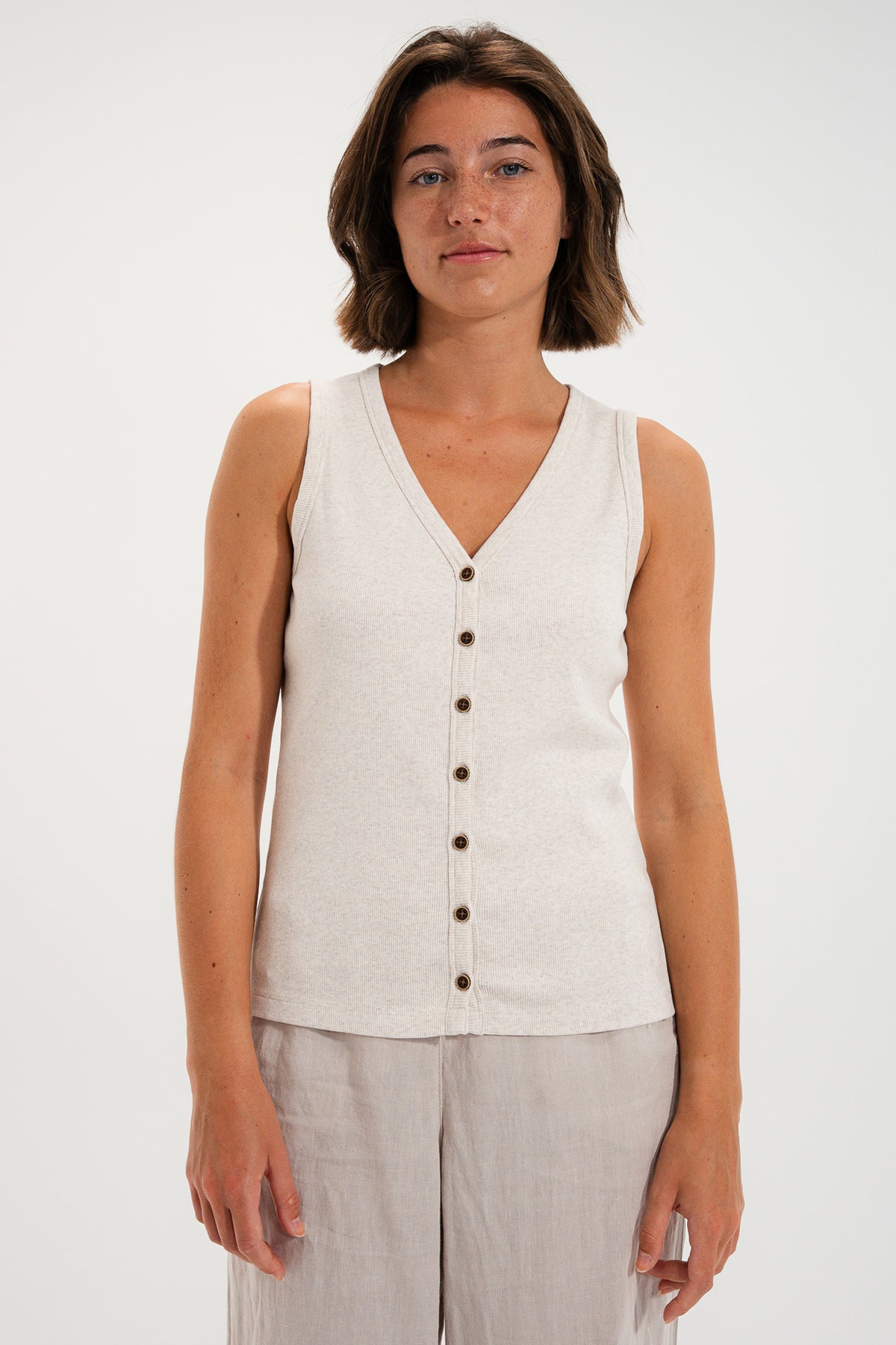 The Mat De Misaine Mora SM-603 in Ivoire Chine is a beautifully versatile sleeveless cardigan you can wear as a top or a light layer. With its flattering V-neckline and button-through front, it’s perfect for warm days on its own, and just as handy layered over a tee or shirt when you want a little extra coverage without bulk.