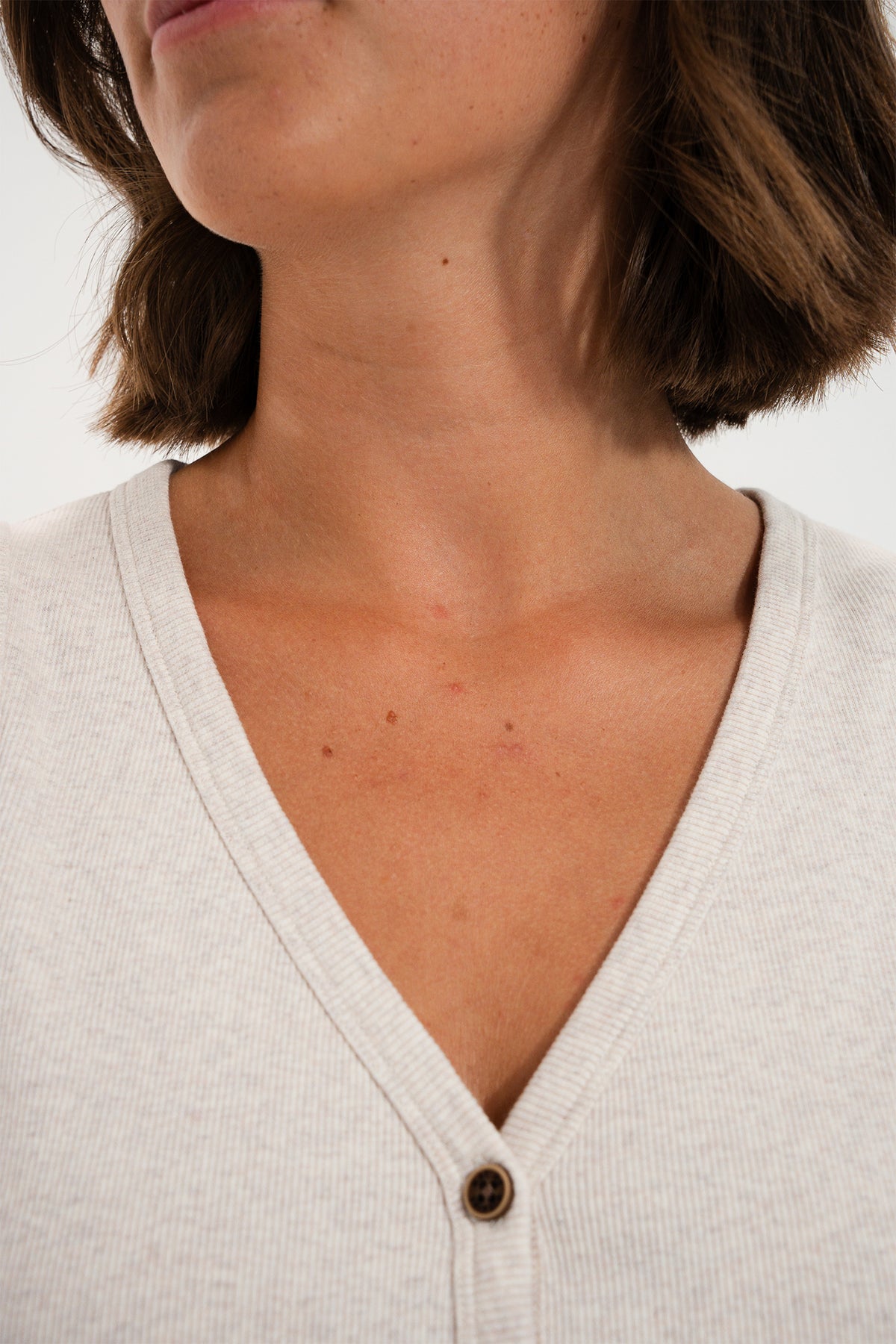 • Flattering V-neckline and button-through front