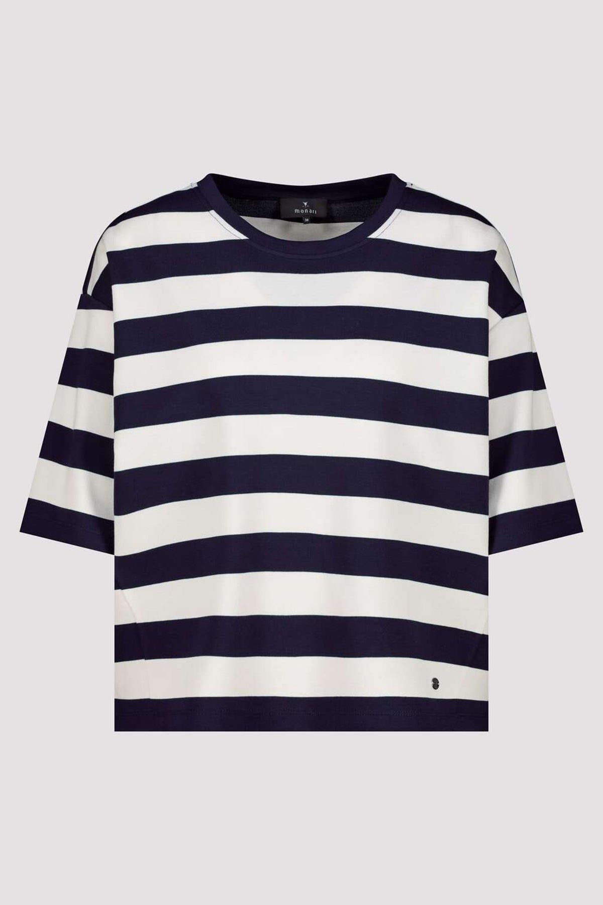A casual essential with timeless appeal, the Monari Marine Navy White Stripe Sweatshirt, style number 410180 756, features bold horizontal stripes in navy and white. The relaxed crew neckline and comfortable short sleeves make it perfect for layering or wearing solo, whilst the soft sweatshirt fabric keeps you cosy without the bulk. Pair with denim for an effortless weekend look.