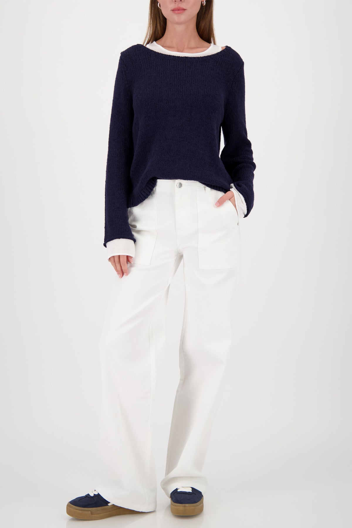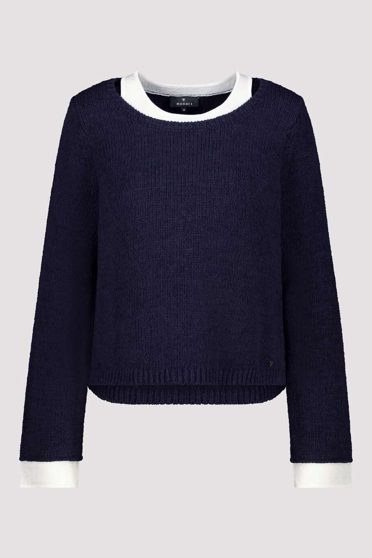 Clever layering meets everyday comfort in the Monari Navy 2-in-1 Vest Layer Jumper, style number 410207 755. This innovative design features a navy knit jumper with contrasting off-white vest detailing at the neckline, cuffs and hem, creating an instant layered look without the bulk. Perfect for adding visual interest to your outfit whilst keeping things streamlined and modern.