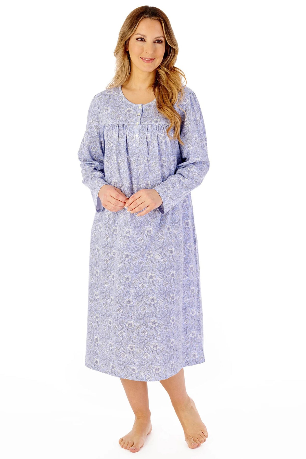 Slenderella ND08107 Blue Indi Print 45" Jersey Long Sleeve Nightdress