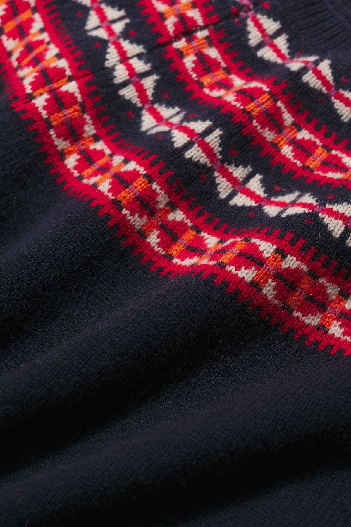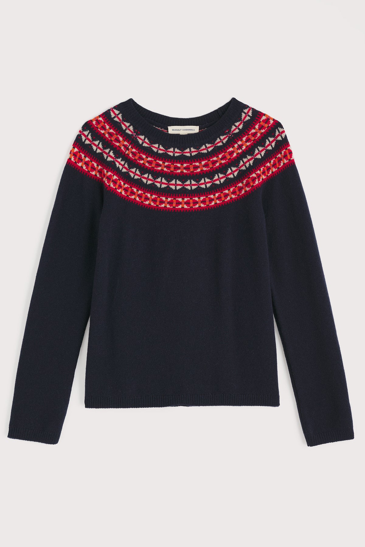 - Navy base with Bedstone Jam Mix Fair Isle pattern across yoke