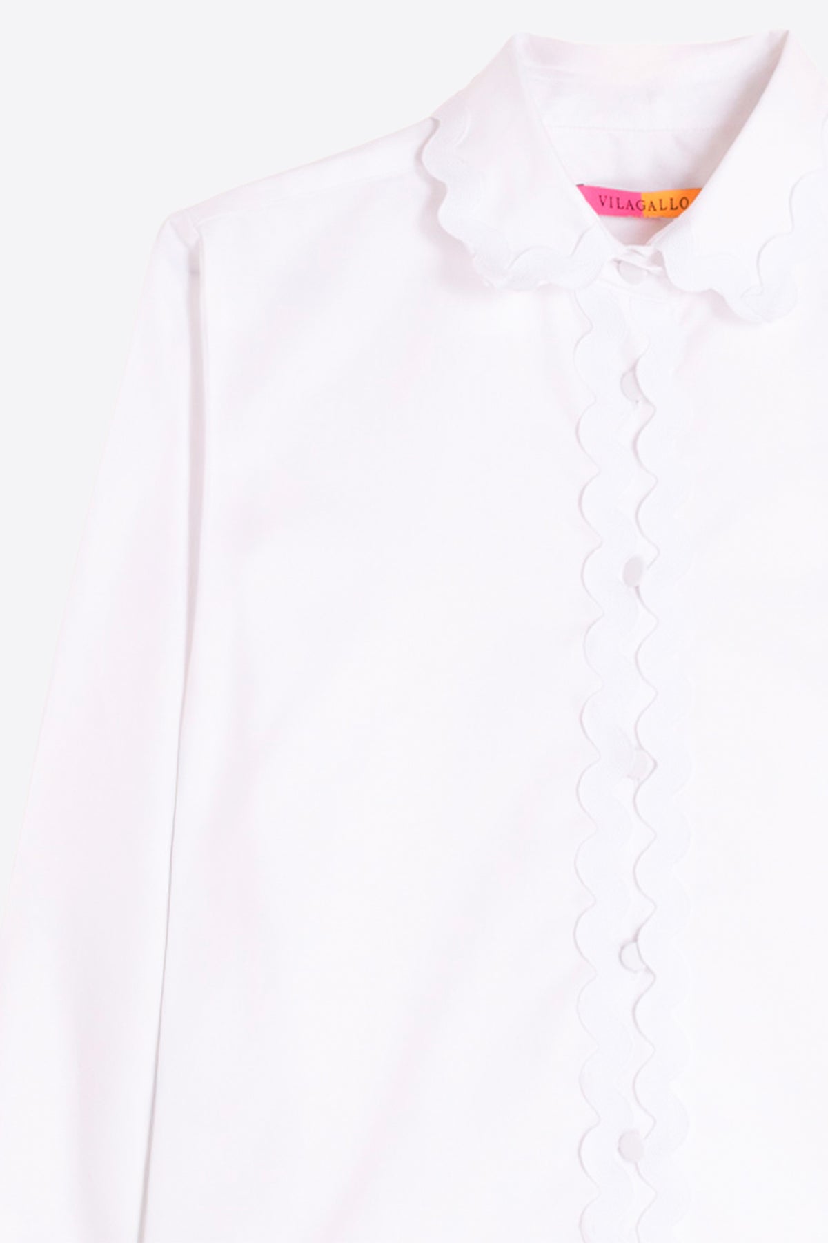 Keep things fresh and feminine with the Vilagallo 33439 White Ric-Rac Shirt, a crisp white button-through that's anything but plain. The real charm lies in the delicate ric-rac trim running down the front placket and along the long sleeves – a signature Vilagallo detail that adds playful texture without fuss. With its classic collar and easy shape, it's perfect for pairing with everything from tailored trousers to casual denim.