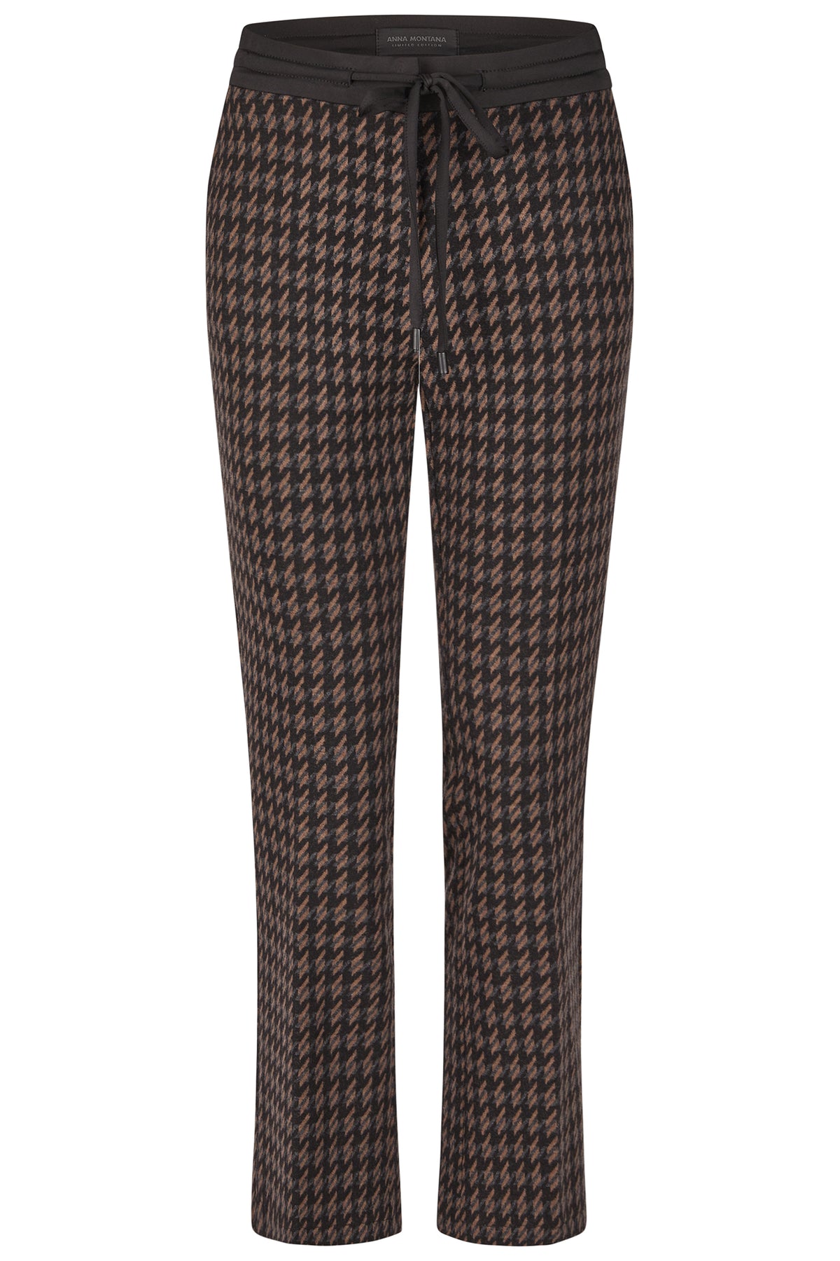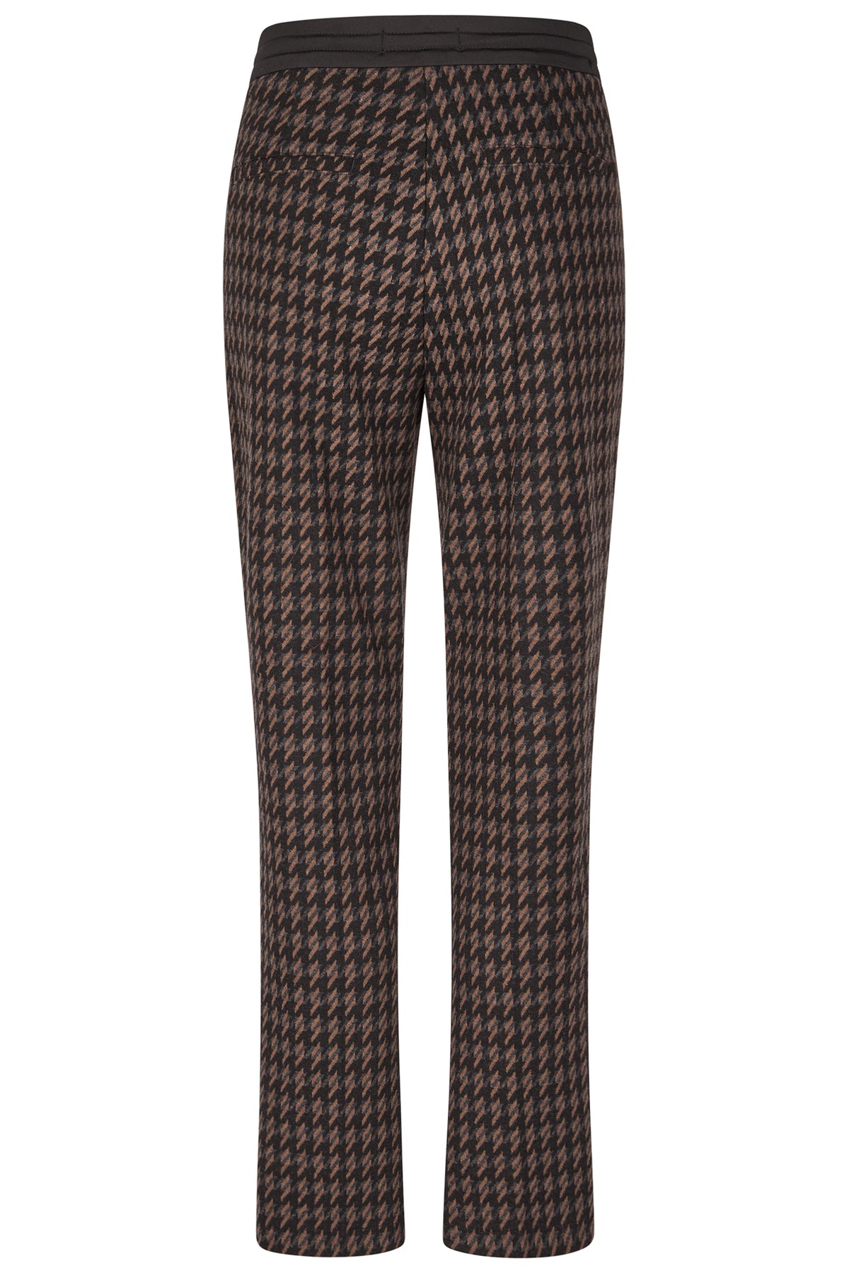 Add a bold twist to your wardrobe with the Anna Montana 1464 4 Rose Original Black Print Easy Fit Ohio Trousers, a standout piece that blends comfort with confident style. Featuring a black base with an all-over brown houndstooth pattern, these trousers offer a flattering straight-leg silhouette and a flexible fit. The smooth waistband and clean back pockets keep the look streamlined, while the soft stretch fabric ensures ease of movement.