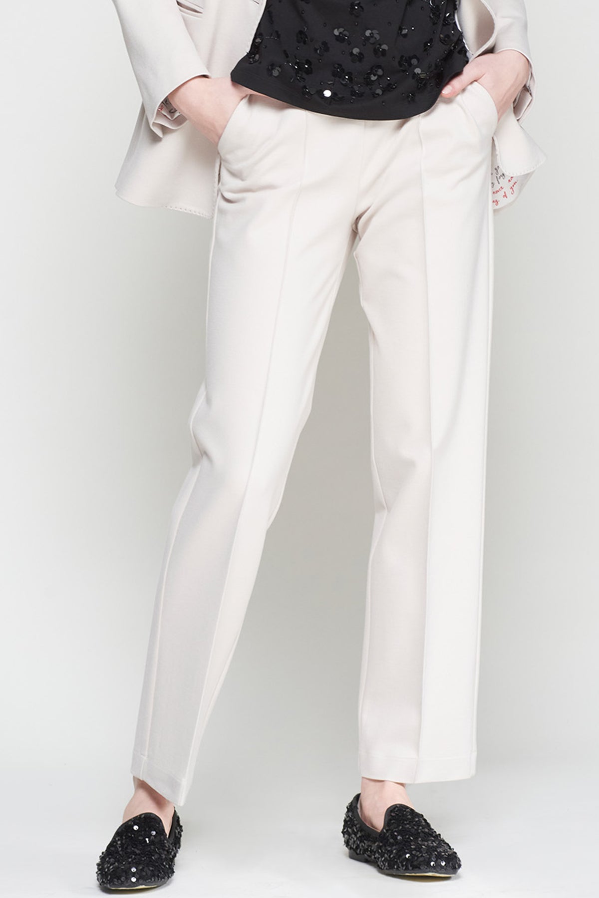 Designed for clean lines and soft structure, the Vilagallo Elisa 32786 Roma Point Raw Trousers blend tailored polish with stretch comfort. Cut in a straight-leg silhouette with front pleats, they offer versatility across seasons and styling moods.