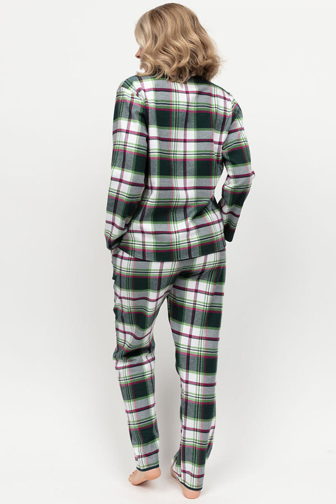 Elevate your evening look with the Cyberjammies Forrest Pyjama Top. Made from 100% soft brushed cotton, this classic check design in green, red, and white offers ultimate comfort. The dark green modal trim, revere collar, and long sleeves add refinement to the timeless silhouette. With a flattering shaped bottom hem, unwind in style and comfort.