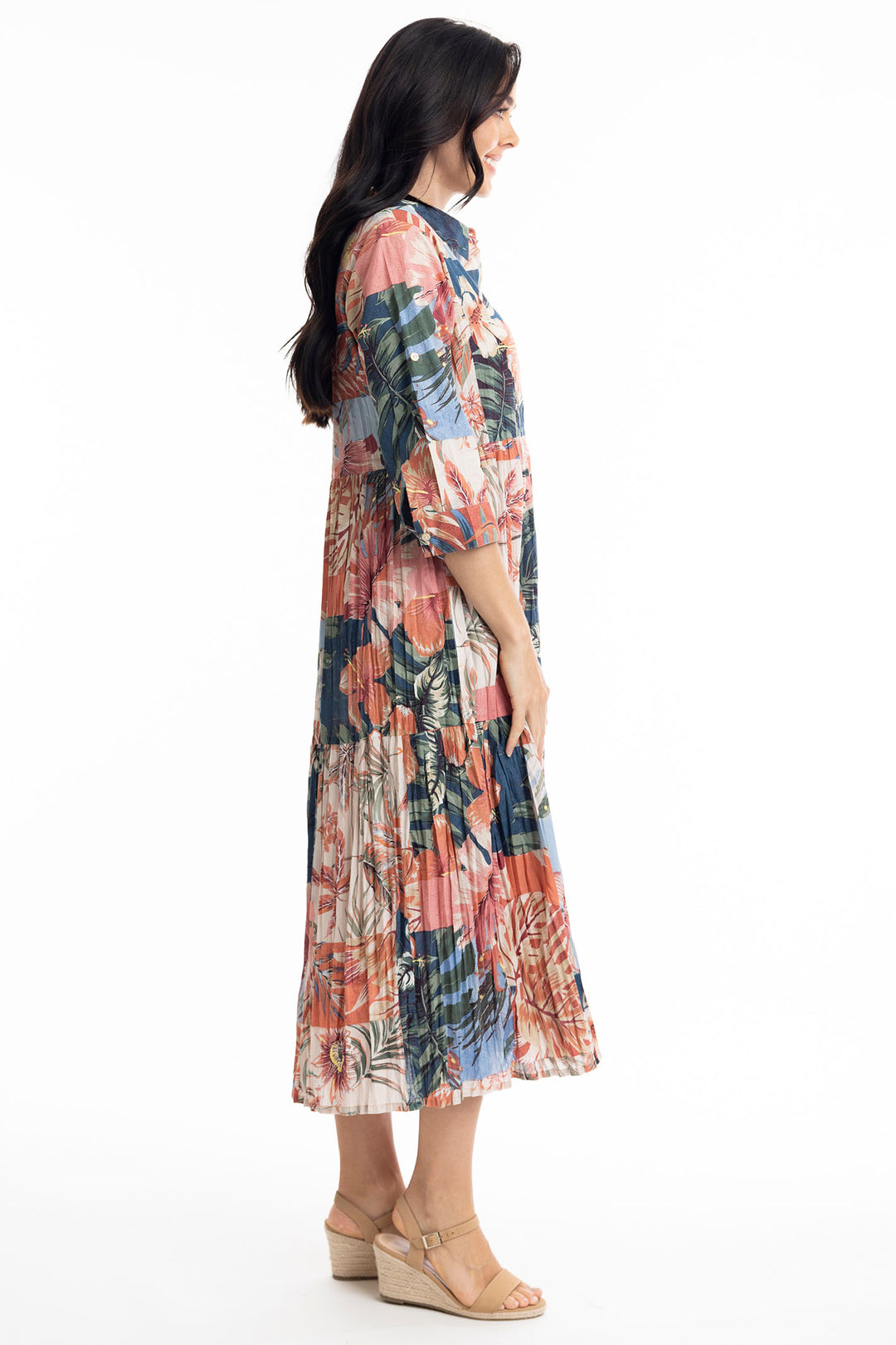 Add a touch of tropical charm to your wardrobe with this stunning midi dress. Featuring a playful mix of prints and a classic collar, it’s perfect for creating effortlessly stylish looks. Style number: 71509.